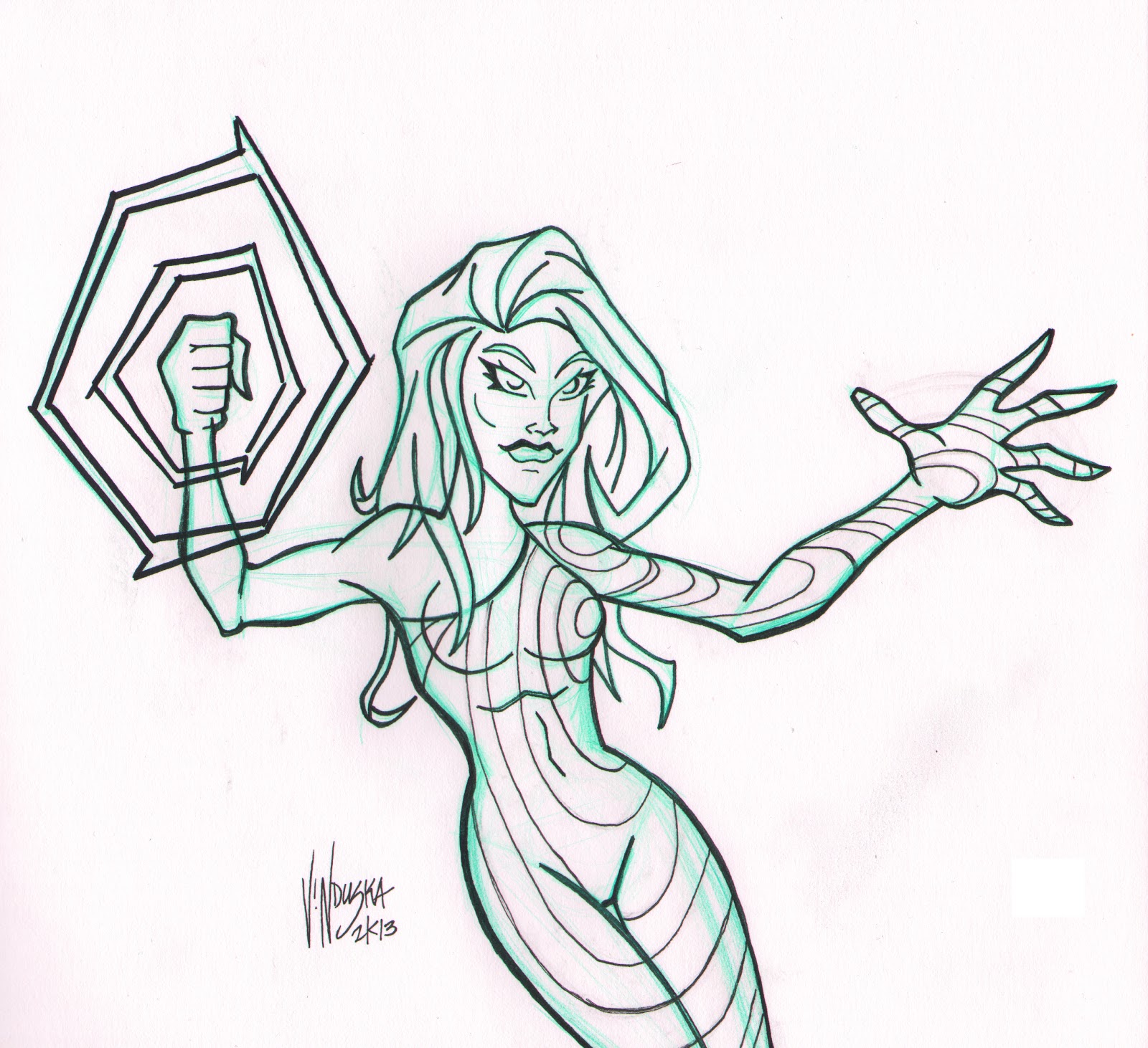 Blue pencil, ink, and Prismacolor on sketch card bristol.